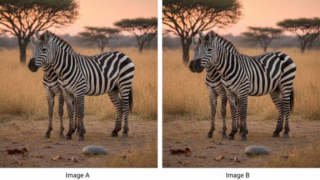 At first glance, the two zebra images look exactly the same. The zebra’s pose, its stripe patterns, and the background scenery appear identical. This initial familiarity tricks the brain into relaxing too quickly. Once the brain assumes sameness, it tends to rush the process instead of carefully checking every detail.